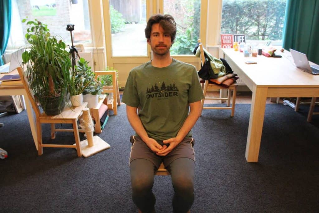 - Easy pose (Sukhasana): sit straight with your legs in front of you, straighten your back and then cross your legs at the shins.